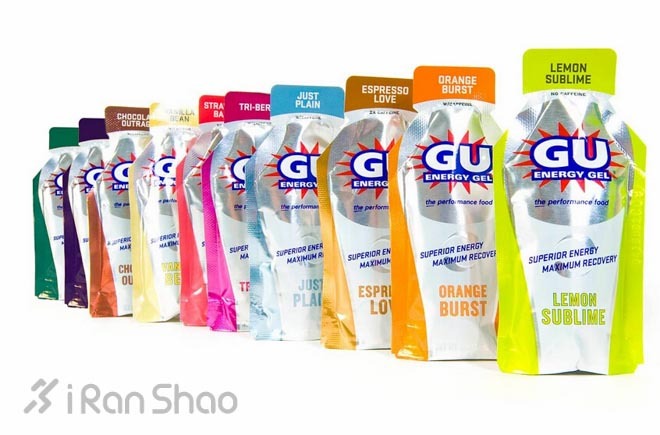 GU的能量胶的有多种口味,从原味到草莓、柠檬、巧克力等味道可供大家选择。不过对能量胶的口味请不要抱太大的期望,它不可能做到像蛋糕一样美味,更多的恐怕是在比赛中饥劳交迫时心理上的满足。常见的GU能量胶一小袋有32g,提供25g碳水化合物,100卡热量,还有适量的钠、钾等电解质。另外,它还有无咖啡因、单倍咖啡因(20mg)和双倍咖啡因(40mg)之选,在供能之外还能提供“打鸡血”的效果,请在训练中尝试后再用到比赛中。