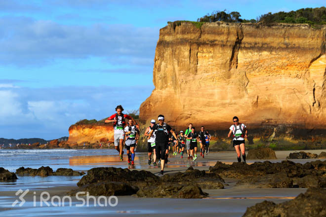 再说说赛道。从起点出发后,可别被一开始细腻平坦的沙滩所迷惑。几公里过后,马上就转入内陆涨潮区的技术地形,遍布礁岩——对,你没有看错,大块儿的礁岩就是海岸线越野赛的技术地形,但总体来说赛道的第一部分(0公里-21公里)趋于平坦。碎石和灌木丛区的单人小径是赛道第二部分(21公里-49公里)的主题,也是整个一百公里相对比较崎岖的路面。赛道第三段(49公里-77公里)是比赛的核心地带,尽管远离海岸线,但机耕路、单人小径以及海岸线的灌木丛区组成的路况,将会是整个赛道最复杂最陡峭的部分,当然最困难有时也是最美好的,大片的野花在此怒放。最后23公里(77公里-100公里)被澳洲TNF100的常胜冠军Brendan Davis形容为比赛真正开始的地方,开头陡峭最后平缓,对于稍有野心的跑者来说,之前的蓄力现在终于可以爆发。