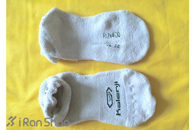 这是个早期的低端款式,已经找不到图片了,只能拍张旧袜子放上来,这款袜子不分左右脚,其主要质地为棉质,低腰,足弓处略有收紧,穿着感觉较舒服,吸汗性较好,内部的线圈儿较松软,脚面的材质较薄且为网状编织,比较利于散热,10公里内的短距离跑步穿着较适合,当时我也没跑过超过10K的距离,但是由于是棉质材料,在汗湿后袜子容易板结发硬,因此个人感觉不适合太长距离的跑步穿着。