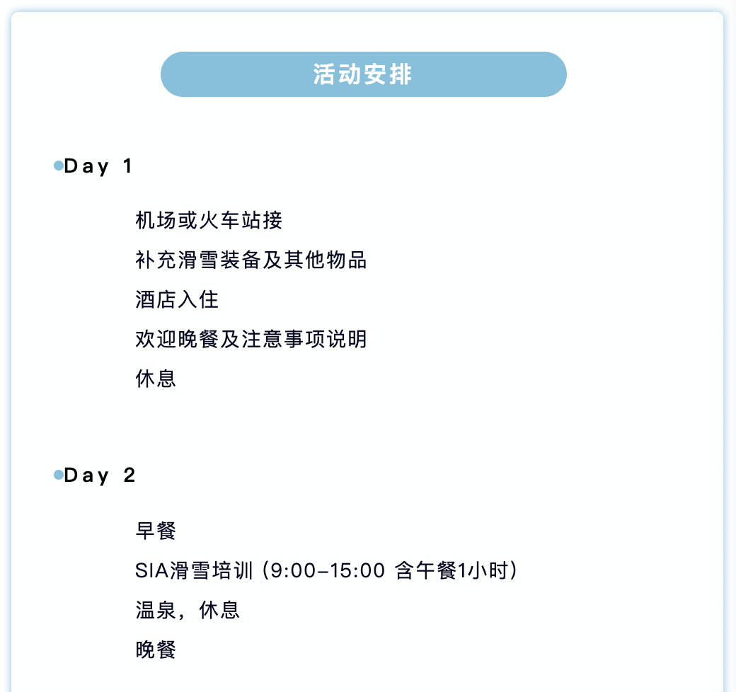 2.陪伴,自行观光:住训练营酒店,白天自己在雪场滑雪或者陪同小朋友,也可以坐公共交通在周边观光。费用收取情况可以咨询小助手。