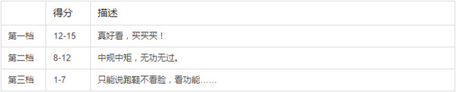 我们将一款跑鞋的满分设置为100分(即iShoes100的由来)。在评分项目上,分为外观、舒适、减震、支撑、耐久、细节、重量、以及附加属性共计八项,总分100分。其中每个项目的分值根据该款跑鞋在专业表现中获得的评价,以及跑友切身关注的特性决定。每项具体指标评价分为三档,按不同权重分别占10、15、20分不等。具体标准如下: