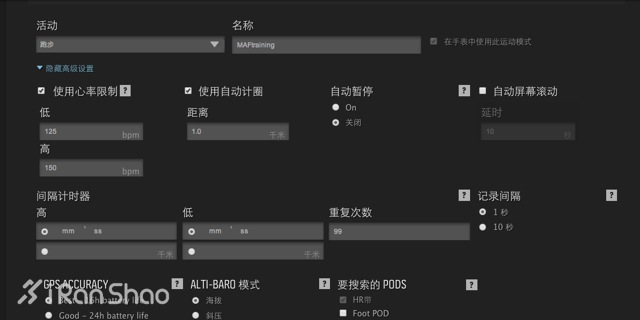 1.日常MAF训练和马拉松赛的模式。将心率设定上下限 150/120 每公里自动记圈的方式。GPS 信号选择了每1秒记录一次的方式。在显示数据方面主要定义了2个屏幕。