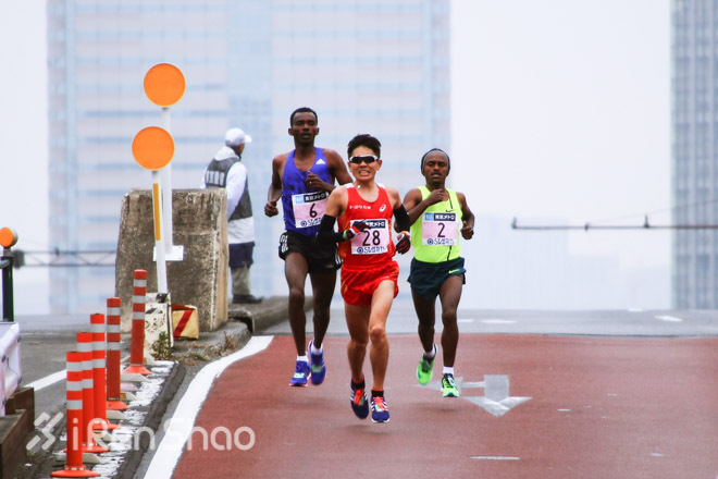 不过,对日本选手来说,2:58的配速已经有些吃力。松村康平、藤原新、山本亮相继掉出第一集团,到25公里只剩今井、佐藤悠基(日清食品队;后面还会提到他)和佐野广明(本田队)三人。