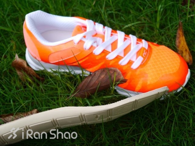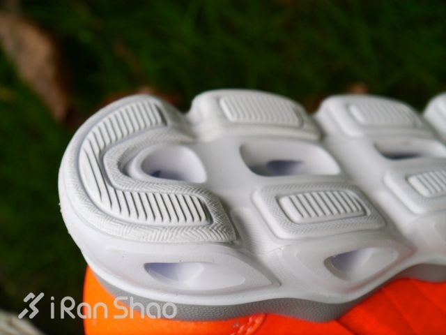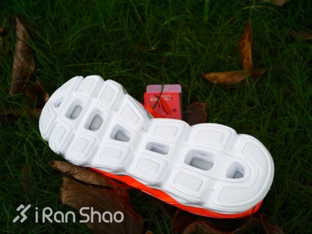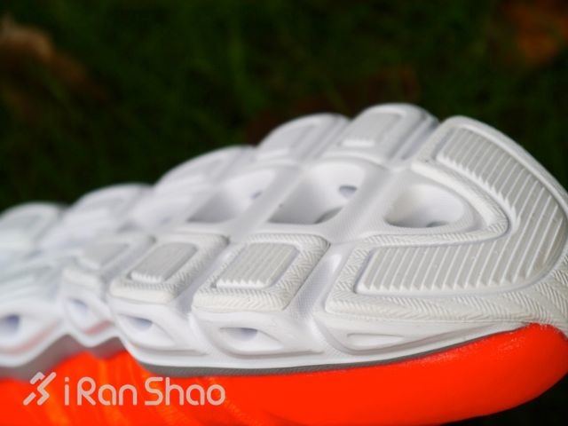 鞋底部分在受力较多的外侧边缘进行支撑,而中间的孔洞除了让鞋底更轻。但是在前掌偏内侧落地的重心位置没有支撑,而且在足弓位置也没有强力支撑。跑动过程中是否会产生过分软的状况还不知道,需要路跑进行测试。