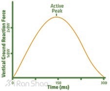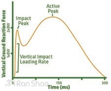 图中一眼可以看到,曲线上出现了两个峰值。第一个是冲击峰值,也叫被动峰值,来自脚后跟最初接触地面最初的瞬间地面反冲给足部和小腿的力(重申一下这幅图是典型的后跟着地跑者的数据)。这一瞬间产生的力并非全身的重量的数值,冲击峰值基本上反映出部分足部和小腿对地面的冲击力。第二个峰值,也叫主动峰值,约出现在中间时刻,来自足部产生的支撑身体重量的力。