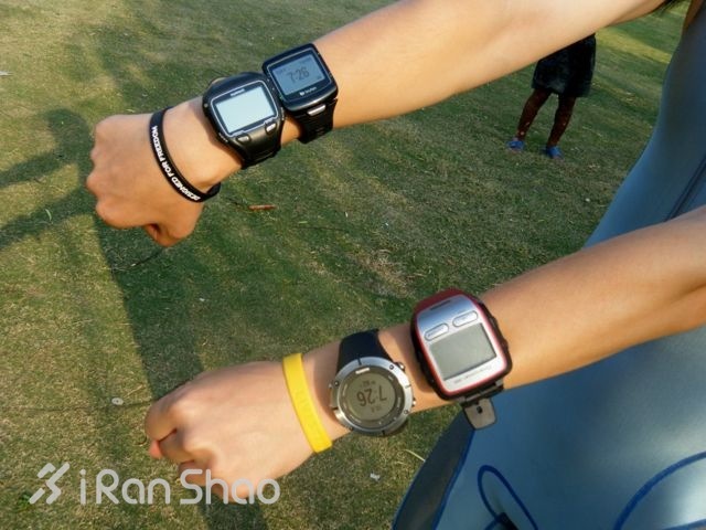下水前四块表的排布位置如图所示(爱燃烧注:其实戴的位置对精度也有影响,越靠近手腕理论上出水时间越长。Garmin305原计划放“跟屁虫”内测试,所以没有下水,请不要模仿。)