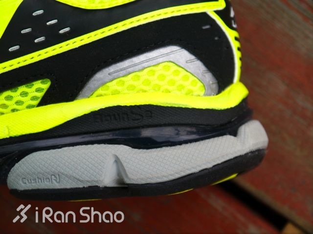 鞋子底部侧面看填充了大量的EVA和缓冲材料,尤其在后跟外侧部位。显然这款鞋更适合后掌落地的跑步群体。
