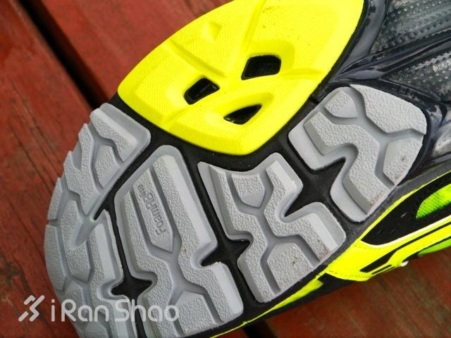 鞋子的底部对前掌,后跟,中部进行了非常明显的区分,而且进行了不同设计。从最外侧的耐磨设计来看,更多的耐磨性放在鞋的外侧边缘。更适合正常足和”膝盖外翻“的跑者。