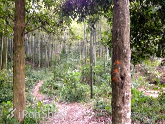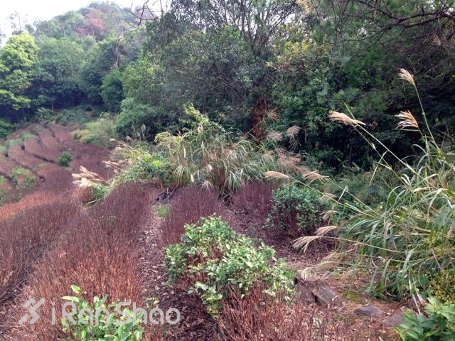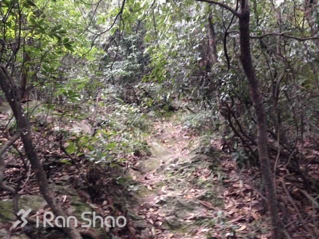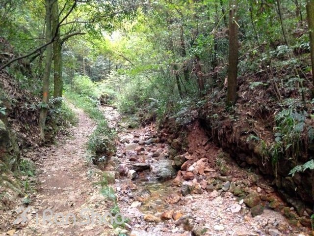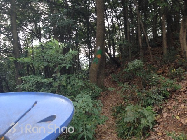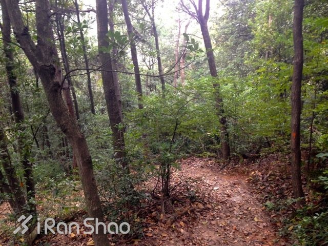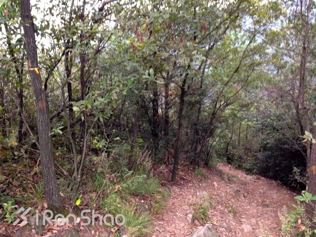 在步道左侧,有一段穿树林下山的野路。几场杭州的越野赛都会选择这条线路。因此路口的大树上的标志清晰可见。不要错过。