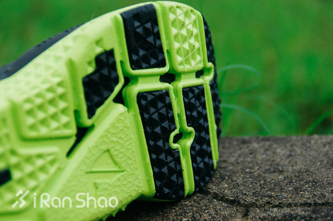 LALO Grinder 的大底并非是耐磨橡胶的全掌覆盖,而是中底泡沫和耐磨橡胶相结合的设计,在重点磨损区域使用耐磨橡胶,耐磨橡胶的设计为突出的尖形设计,大大增加防滑性能。不过这些区域屈指可数,除此之外的区域使用的是中底延伸下来的泡沫材料,虽然防滑设计与耐磨橡胶相同,但是其寿命和耐磨性可能会大打折扣。
