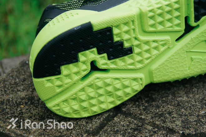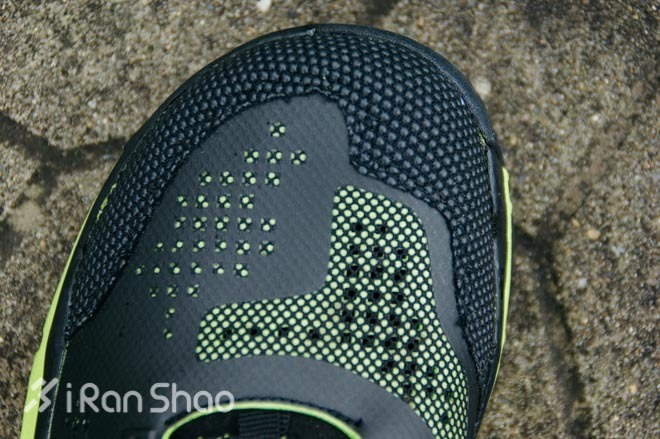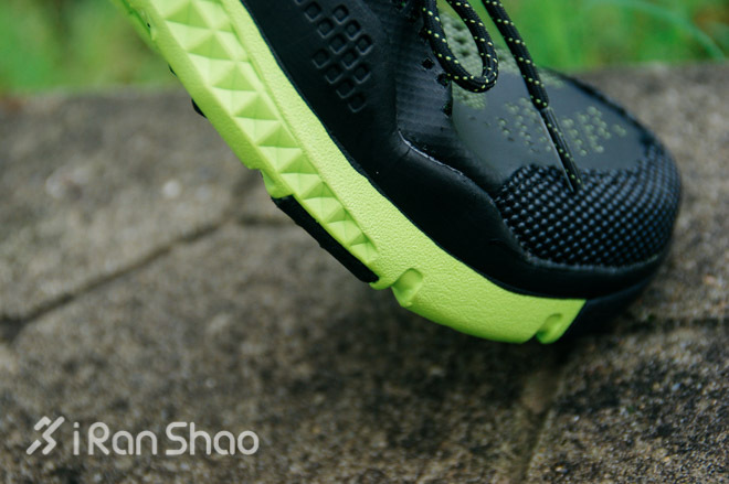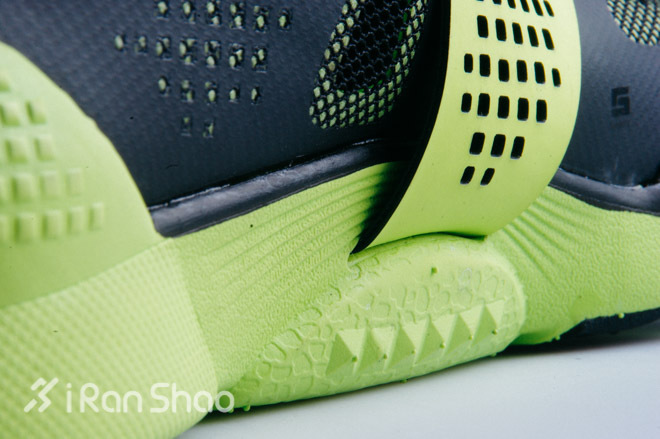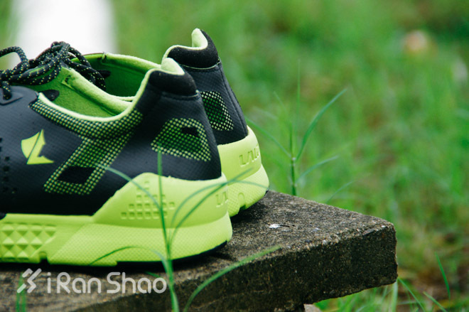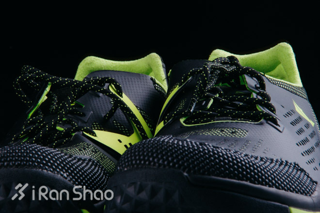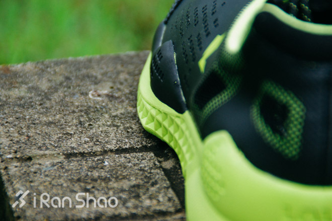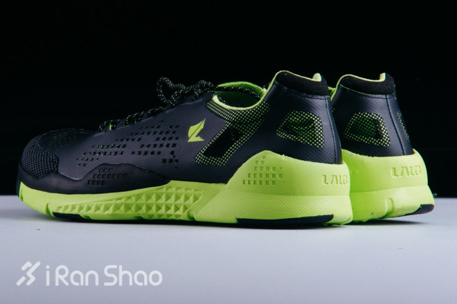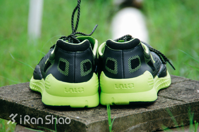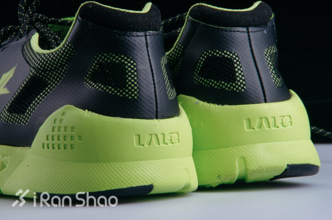 这双 LALO Grinder 配色采用荧光绿搭配黑色,荧光绿除了用于配色之外,还承担了夜晚夜光反射的功能,两者颜色的组合搭配让它着实有点户外鞋的味道。鞋身的设计似乎有点过于复杂,各种鞋面材料和鞋面支撑的组合以及透气网孔的分布,让这双 LALO Grinder 的颜值几乎降到了最低,这也是为什么看到 LALO Grinder 会觉得他的造型很怪的原因。