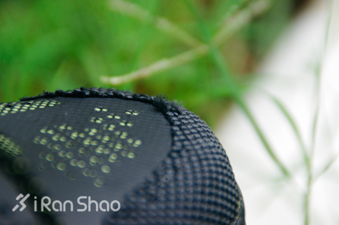 LALO Grinder 的鞋面十分轻薄,有内里、网面和热贴合皮革三部分组成,即使是在需要重点保护的鞋口和后跟位置也只是在边缘加入了一点海绵而已。鞋面的设计非常注重透气性,从后跟到两侧再到鞋面前部,在你能够看到的位置都有各种透气网孔,甚至 LALO Grinder 的鞋垫为了透气都开了一个个透气的口。当然,LALO Grinder 的透气性也没有让我们失望,简单的试穿时也能感受到风在鞋内流动的感觉。