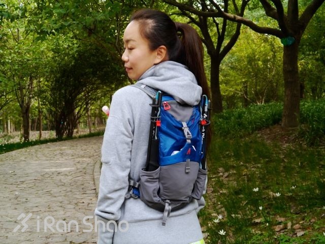 两侧的弹力口袋可以插登山杖。再用上部的固定带固定紧。