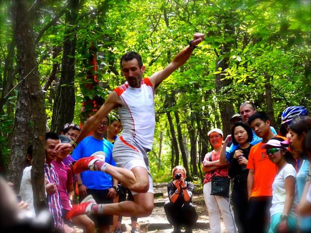 Greg建议利用自然环境来帮助自己跑步。他在演示利用一棵树减速,转向。
