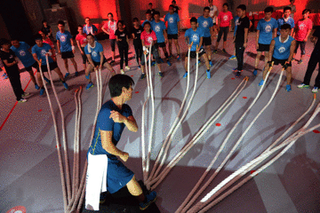 我跟着 N 走到战绳训练区,这些经常在健身房里看到的训练器材,对于没有什么系统训练的同学来说挑战性相当之大,N 尝试了一下战绳,然后又弱弱的放下了。从下午 2 点到 6 点, 四个小时的时间里所有人都要轮流完成四项训练,为晚上的第一轮淘汰赛做准备。