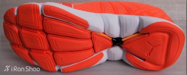 这款Puma Mobium Elite Glow 的大底完全颠覆我们印象中大底的样子,大底设计灵感来自美洲豹的脚掌伸展方式,整个大底的设计被有层次的设计成很多块,按照PUMA的介绍有革命设计的““Mobium Band”——十字交叉的“弹力带”实现动力;windlass chassis ——高足弓脚步的灵活;创新EXPANSION PODS ——前掌的分区实现减震和支撑。与传统大底不一样的地方除了造型结构,就是这多出来的一根“弹力带”。而比较好奇的是,PUMA真的很用心的在做这款鞋子,错综复杂的嵌入式的橡胶大底其实在生产操作上有很大的难度,而PUMA为了实现它的设计理念,确实花了很大的力气。相对第一代的Puma Mobium 女装的Puma Mobium Elite Glow Wn’s 做得更为简约,因为后跟增加“微量射出”工艺,就把中底像鞋面延伸部分减少了,这样整个鞋面更简约。