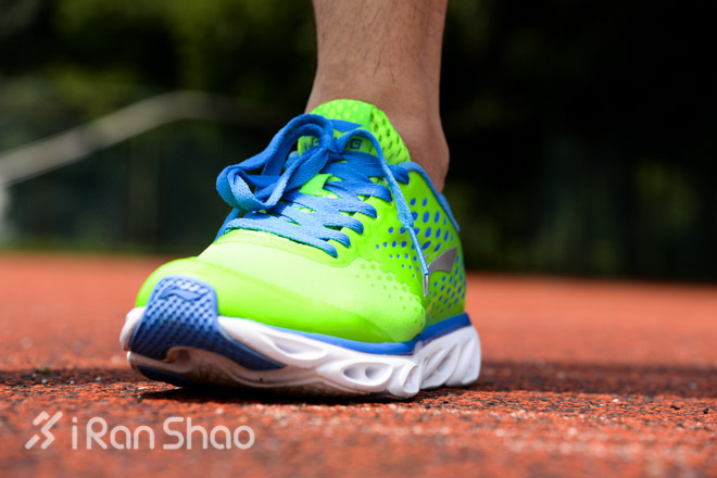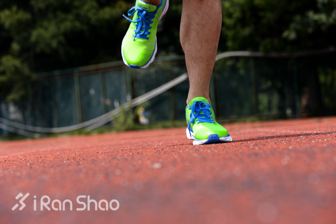 在面对质地偏软的塑胶场地时,弧五代弧底的回馈似乎并没有想象中那么地敏感,但改进后的弧底在踩地时的实地质感,相比前代更加明显,没有明显的泄力。尤其在热身后的加速感明显,这显然是得益于鞋底中轴“弧脊椎”的加入,增加了鞋底支撑带来的成效。