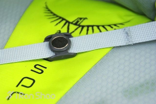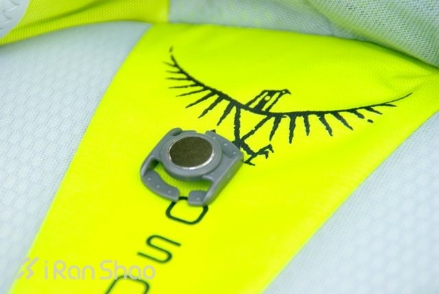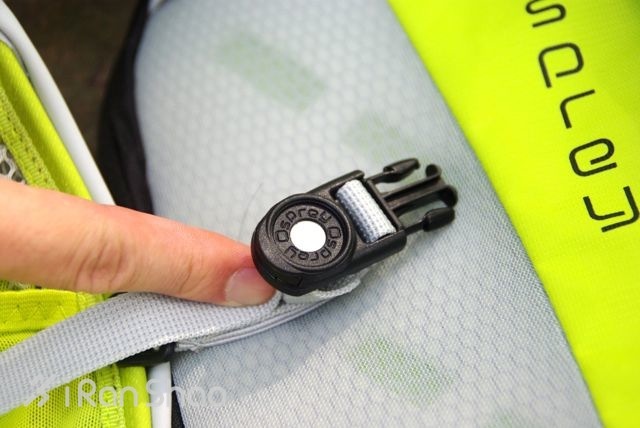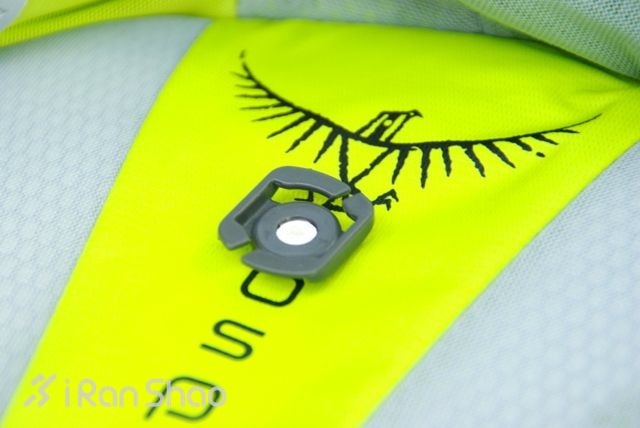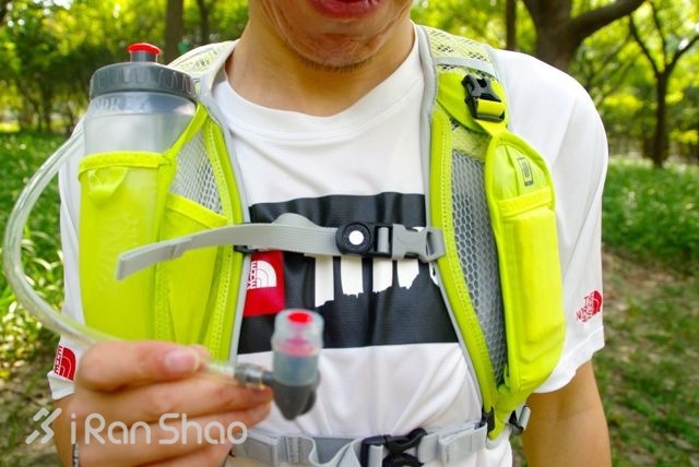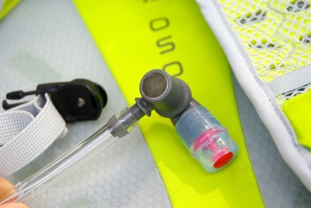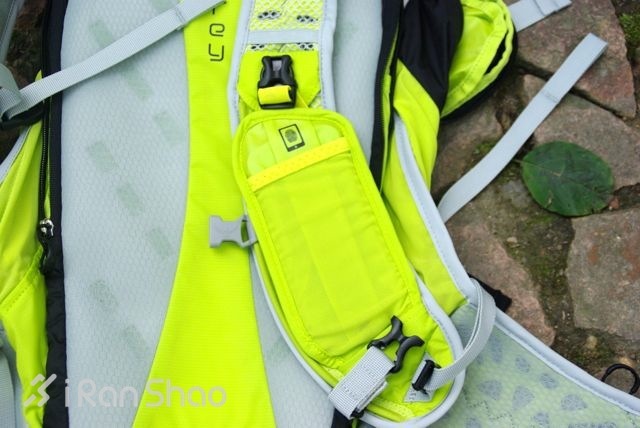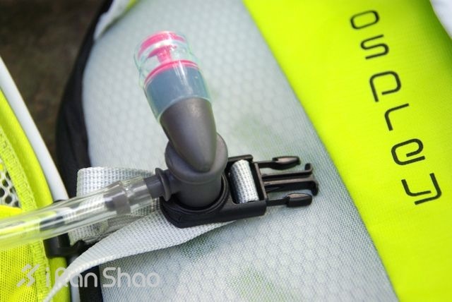 背包的吸管口在胸前的带子口快速固定。并且胸前的带子可以沿两侧导轨上下调节,这是 OSPREY 背包较为独特的设计,同样的设计也出现在 Nathan 的越野跑背包中。