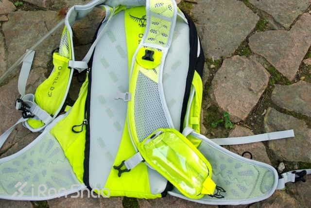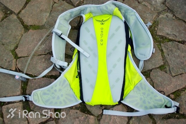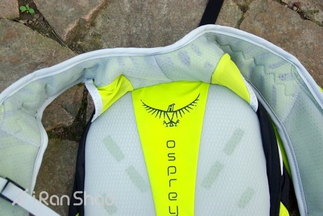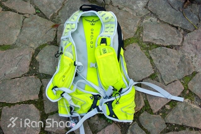 整个背负系统采用网布+衬垫的做法。这种设计在6升背包中看似比较繁琐,而在12升背包中就比较必要了。关于6升背包参考《大容量越野, OSPREY REV系列 6L越野跑背包评测》这篇文章。