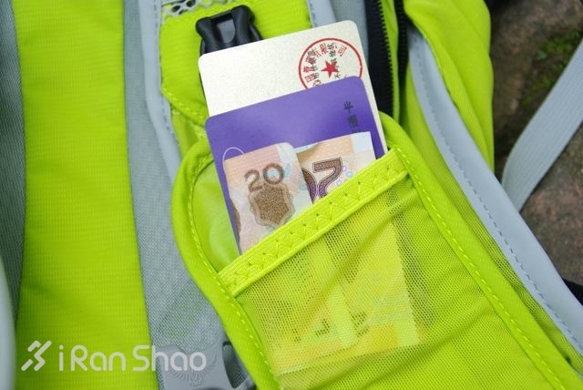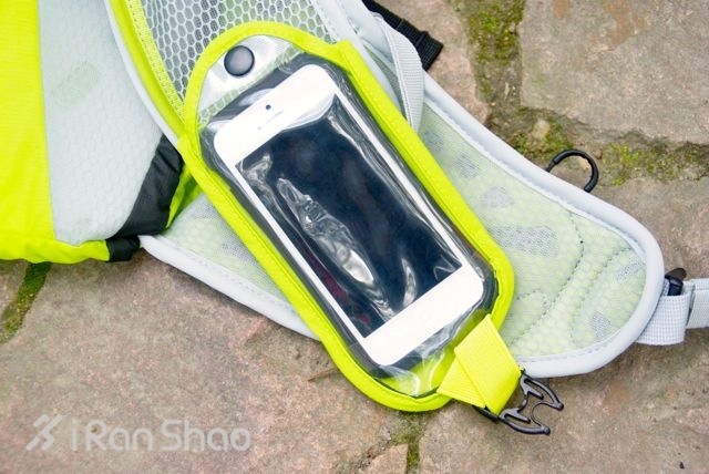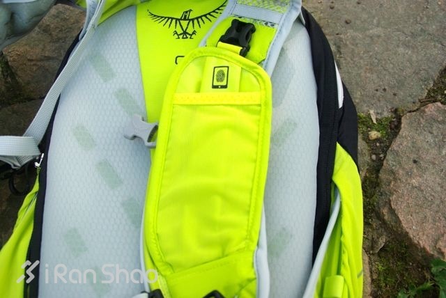 背包的左侧肩带为手机袋,采用的还是创新式的翻开透明薄膜的手机袋。接电话,发微博等操作都无需将手机取出。