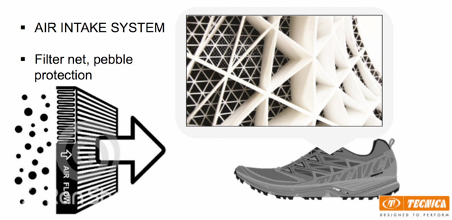 侧面镂空的设计在雷电 XLITE 3.0上得到了强化,镂空部分使用了更轻薄的全新细网面材料,杜绝了在闪电 XLITE 2.0上出现的进砂砾的问题,而这一全新的AIR INTAKE SYSTEN也保证了穿着过程中的透气和舒适性能。