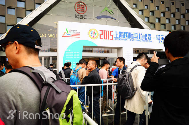 上马EXPO第一天现场用人气火爆来形容一点也不为过,说是早9点开放领取装备,可不到9点在世博展览馆北门已经人头攒动。穿着统一运动服的展会志愿者们在入口帮忙分流,选手们也配合出示自己的报名单,按照参赛项目(全程,半程,健康跑)来进行初步分流。