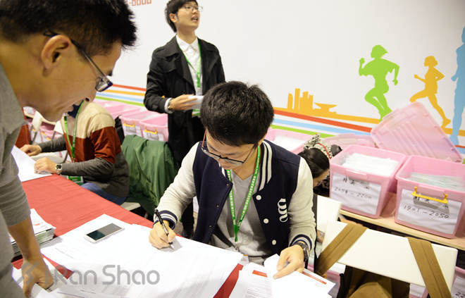 (志愿者几乎一刻不得闲的核对信息、分发号码牌和芯片)
