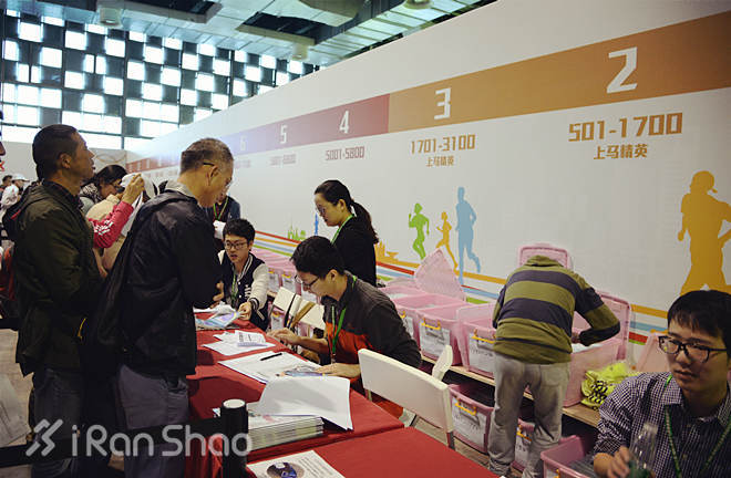 而进入展馆内,更是热闹的不像话,虽然满眼是来领物的跑友,但不超过5米一定也会有热情专业的志愿者帮跑友们解决现场问题,领物区也按照号码段被有序安排,志愿者都十分耐心和细心地核对领物参赛者信息。