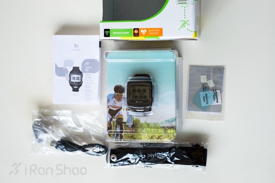 拆开包装,可见 C60 GPS 手表、无线心率带(C60E 为单机版本,心率带需另外配置)、USB充电数据线、简易说明书、屏幕贴膜&擦拭布和产品保固与安全申明。