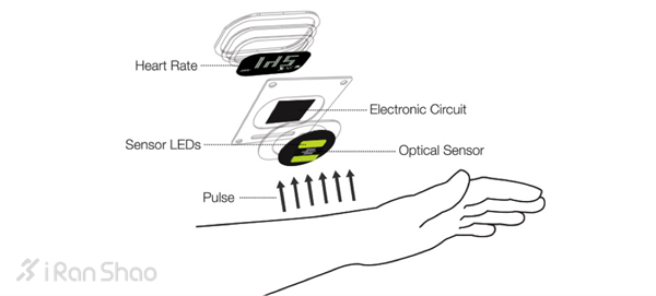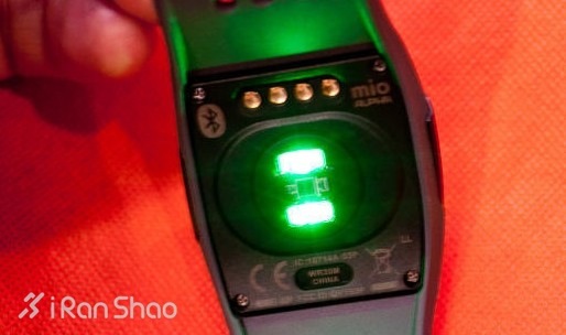 而 Mio Alpha 使用光信号来测量脉搏,表盘背面中心有一个光学传感器。手表工作时,传感器两侧的LED发射光线照射到皮肤上,Mio Alpha 通过光学传感器来获得脉搏数据。