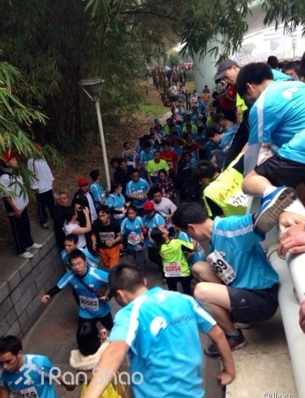 据现场选手介绍,事情起因是上桥前面有个指示牌说“全程走桥下,半程、轮椅组走演武大桥”,结果到了分岔口,现场的民警封了桥下的路,让选手都全都走桥上,桥上的志愿者更正说“全程桥下,半程才上桥”。然后跑前面的全程都往回跑,后面的往桥上挤。这时有全程选手发现桥边可以下去到正确路线,有几个“先行者”之后,就有好多人跟着“跳了”。