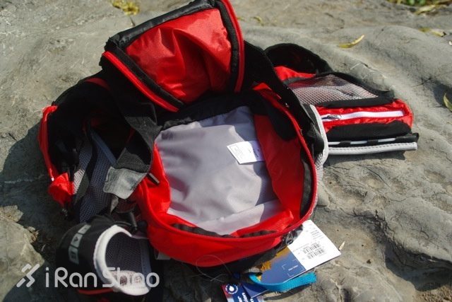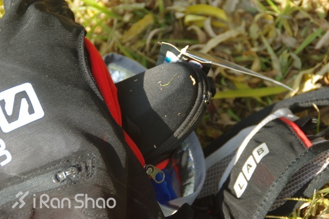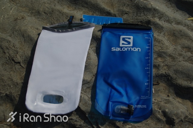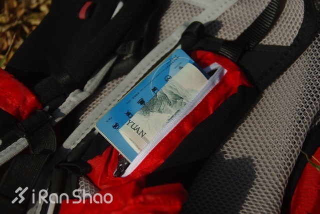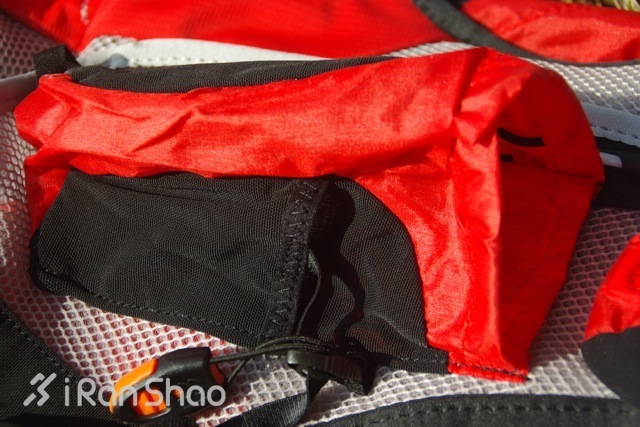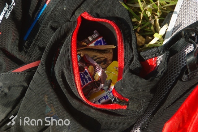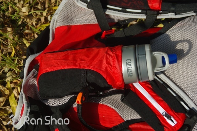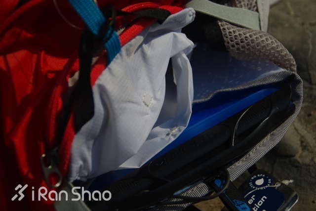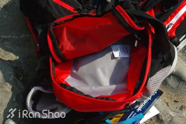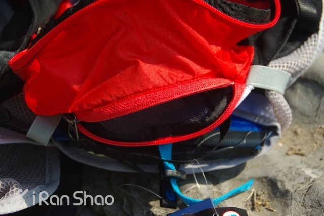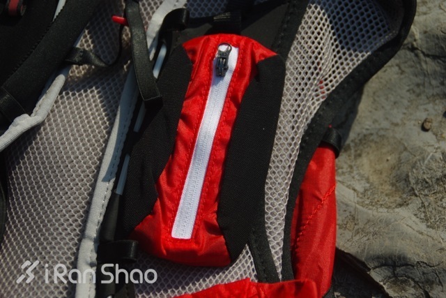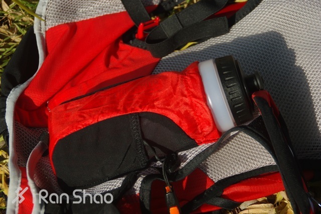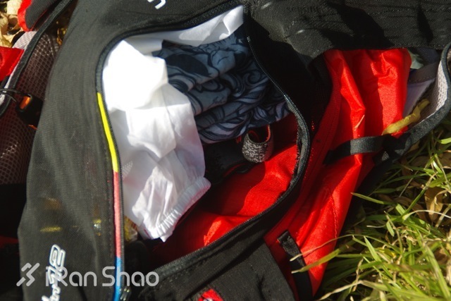 水袋仓采用的是Hydrapak的1.5L水袋,外加保暖外套。这个设置也可以看出背包仅仅为了比赛而设计,并未考虑长距离训练需要携带大量的水的情况。1.5L水对大部分比赛来说都足够2个补给站之间的使用了。而把更多的背包空间留给了其他口袋。
