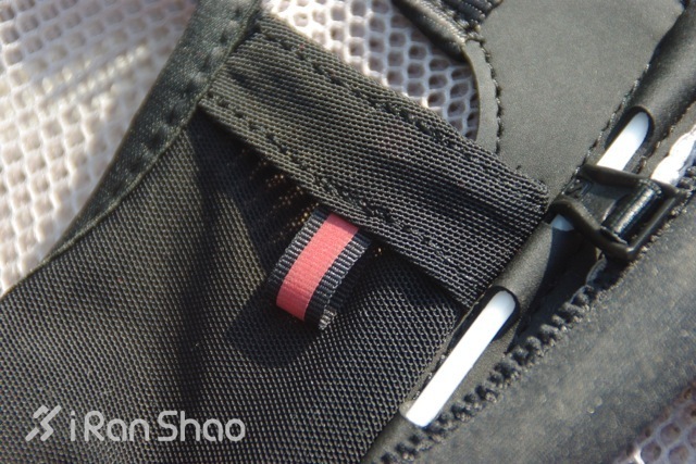 在腰部和两侧,每侧设计了两层口袋,一层拉链口袋,一层敞口的口袋。拉练方向是从后向前的方向,在跑动中不解下背包的情况,这个方向非常顺应习惯的方向。