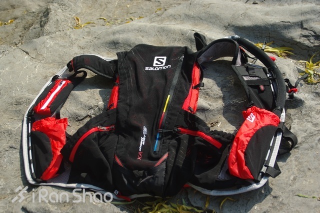 背包本身延续了Salomon的 S-lab 系列背包的特点。黑红配色。外侧使用轻量化的弹力网布,内侧是水袋仓,通过水袋的外套来解决背负舒适性的问题。整个背包含水袋只有530克,这个重量在同规格背包中算是比较轻的了。