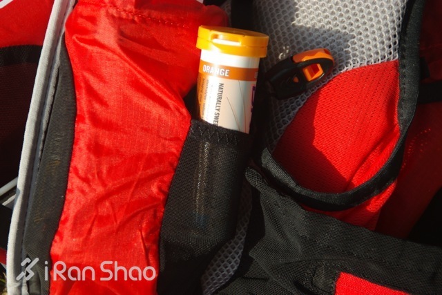 在弹力口袋外侧的夹层可以放泡腾片,盐丸等东西。但有一个问题,两侧并不对称。我们在使用中发现,如果装了水壶,有吸管的一侧由于吸管占了一定的位置,因此无法放进泡腾片的圆柱形盒子,另一侧则刚好。