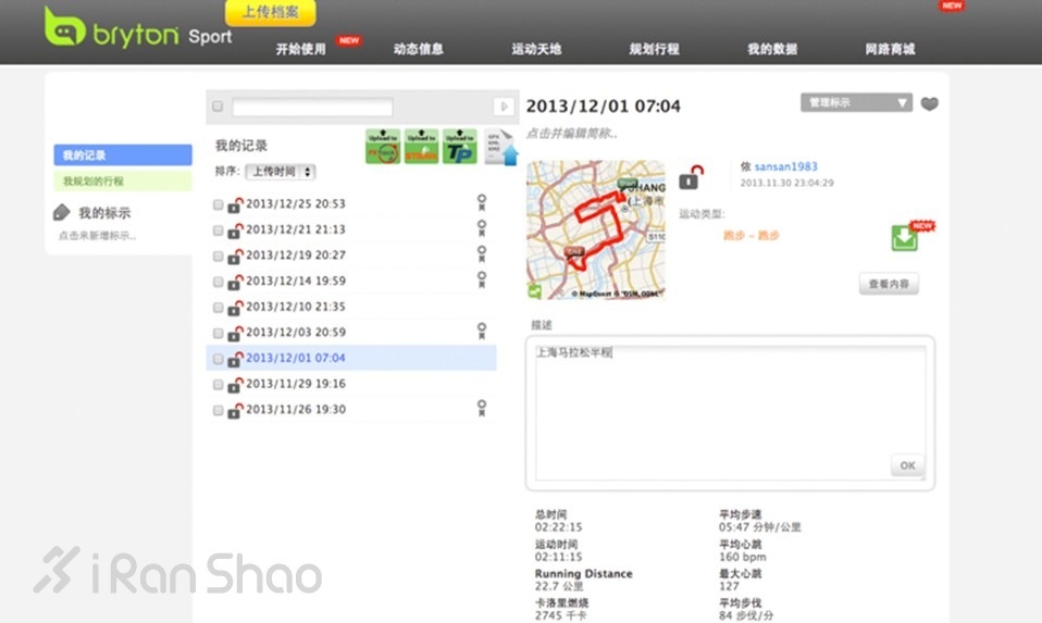 点击“我的数据”,所有上传的运动信息一目了然,右侧有简单的运动概述同时还可以进行备注方便以后的查询。点击右侧的“查看内容”就会进入详细的运动数据概述界面了。