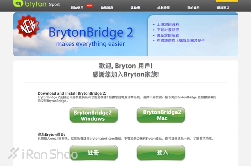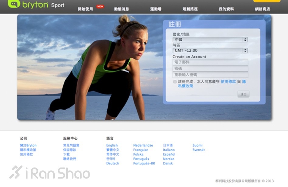 在浏览器内键入 http://www.brytonsport.com ,就可以登录百锐腾系列设备的后台网站了,默认的语言是繁体中文,不习惯的话可以自行设置为简体。然后需要注册一个百锐腾的云端账号,以后的所有运动数据信息以及分析报告都将保存在这个账号中,只需输入账号密码就能随时随地进行查询。