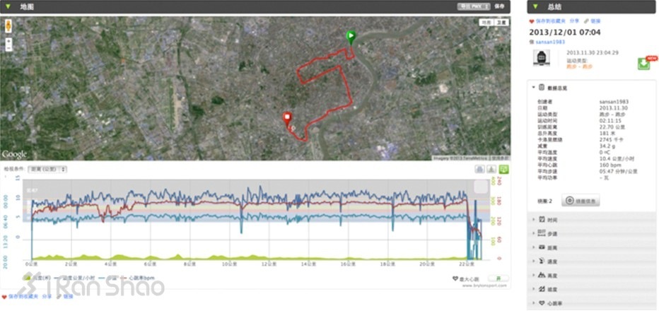 运动数据概述界面涵盖了地图信息、数据图表和分类数据明细。地图使用的是谷歌地图,GPS轨迹在卫星视图下显示正常,但如果使用地图视图则有可能出现漂移;数据图表可以对整个运动过程中的主要数据起伏状况有一个直观了解,在下方还可以增加或筛减数据选项随意得到你想要知道的数据比较;分类数据包括了运动智能手表及外设记录下的全部运动信息,可以配合图表对自己的比赛训练状况深度的了解。