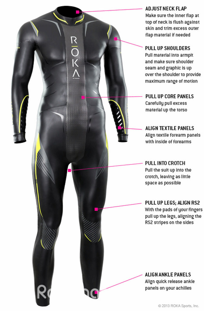 胶衣的选择也是很有讲究的,Roka,Blueseventy,TYR,Orca,HUUB,Zoot,Speedo以及2XU等等都是大牌的胶衣生产厂家。以最负盛名的Roka Maverick胶衣为例,分为Pro,Elite和Comp三档,原价分布为$800,$550,$350三档,分别为顶级选手,进阶选手和新手准备,选择淡季入手通常会有大幅度的折扣。虽然所有的胶衣都具有保暖和提供浮力的作用,但正所谓一分钱一分货,不同档次的胶衣在材质和剪裁设计方面都能体现出显著的区别,你的银子最终将体现在穿着的舒适性和比赛表现的提升当中。笔者曾先后穿过Xterra的低端无袖胶衣($300打折后$108)和Roka的中高端Maverick Elite胶衣($550打折后$250),至少能感到2点区别:一是后者的橡胶整体质地更柔软,关键部位不勒,二是肩部灵活度更高,这个会影响你的移臂划水;此外后者基本可以通过两脚互踩把胶衣脱掉,不会像前者那样需要使很大劲把胶衣从腿脚拽出来。