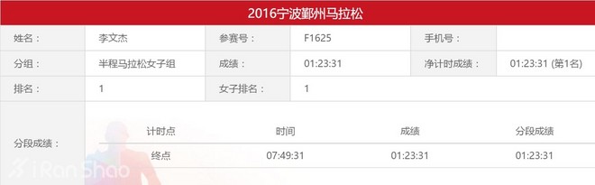 6月26日周日,2016宁波鄞州马拉松,她雨战再夺第一,成绩1:23:31,奖金3000元。