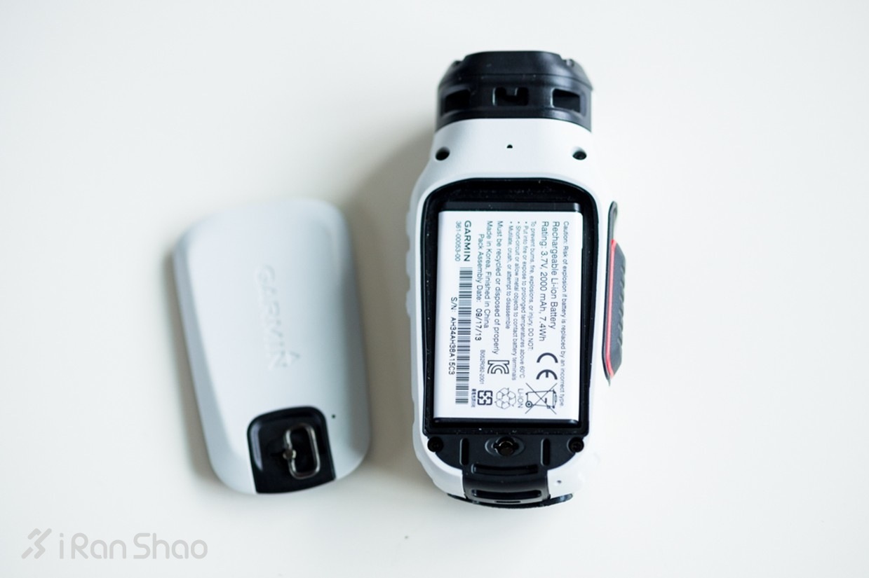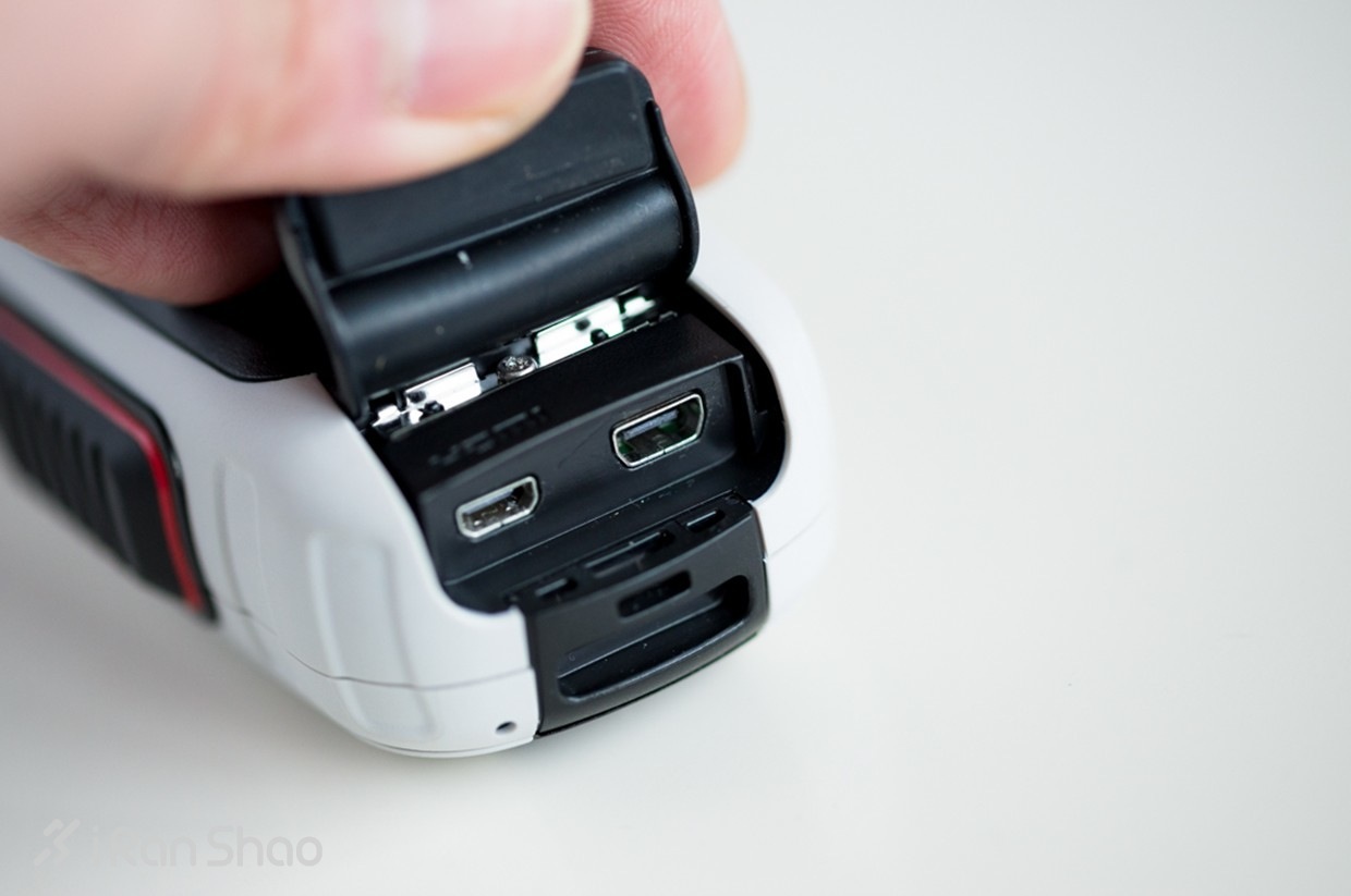 Virb本身没有内存模块,通过支持最大64G的 microSD 卡进行数据存储。数据卡槽被安排在了类似手机 sim 卡的位置,取出和插入需要拔出电池,略有不便。