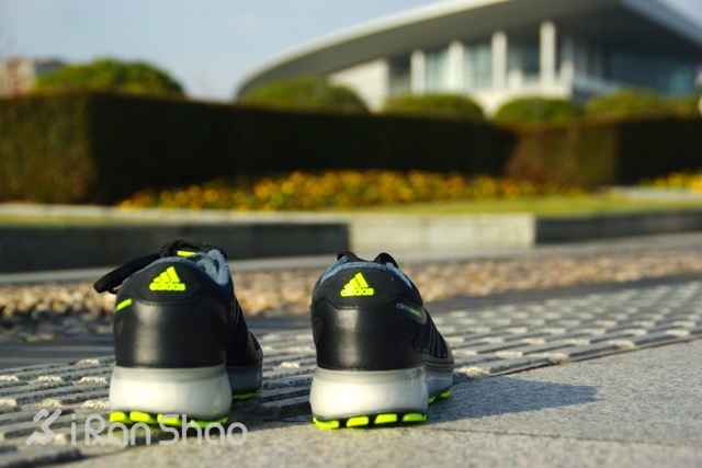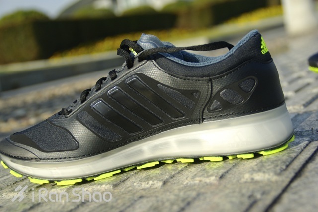 这双鞋拿到手上的第一个感觉是并不重,因为大多数人只要听到保暖两字,就会立刻联想到“厚实”两字,但这款的重量控制地真心还可以,应该单只仅在300克左右。整鞋外观简洁,黑色的三条扛标识镶在黑色的鞋身,貌似低调,但是搭配了银灰色的半透明中底,且大底上的TRAXION奇钉是荧光绿色的,在走动或者跑动的过程中,会不时显现,如此小的撞色设计,时尚也闷骚,上脚两天就有人夸鞋好看。