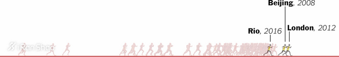 在下面这张图上,三个时期的博尔特出现在一条赛道上,分别是来自2008年的北京,2012年的伦敦,和2016年的里约。伦敦奥运会上他创造了维持至今的男子百米奥运赛会纪录,9秒63.