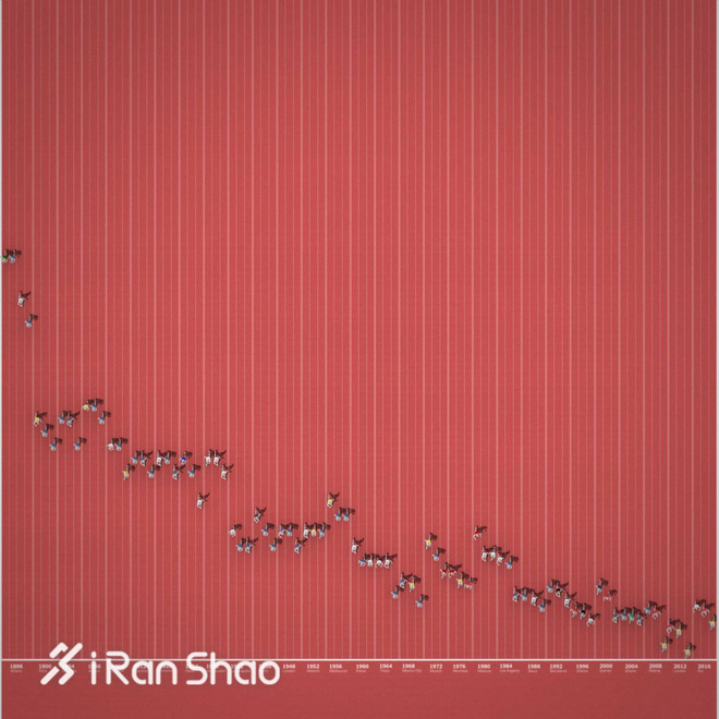2012年博尔特的速度最快,在那个版本的他抵达终点时,另外87人次分别处于这样的位置。奥运120年来,什么是更高、更快、更强,人类是如何越跑越快的,这就一目了然。