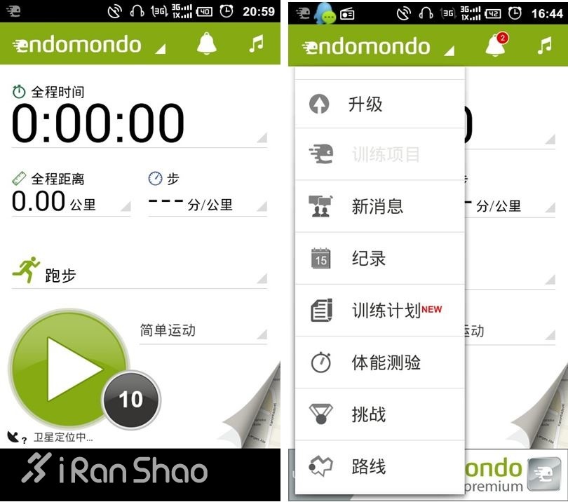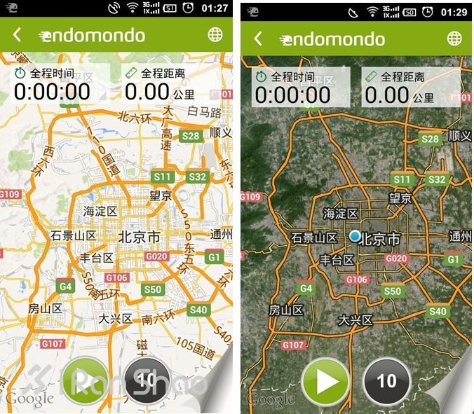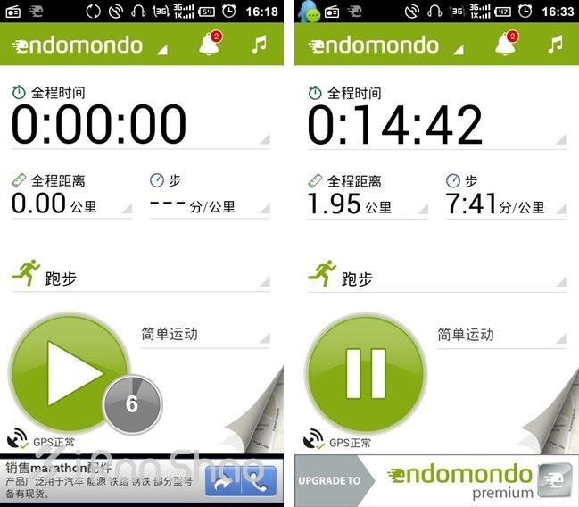免费用户最下面的部分是广告栏(左图黑色部分,刚启动广告还未加载时截图),右图可见Endomondo自家升级付费版的广告。