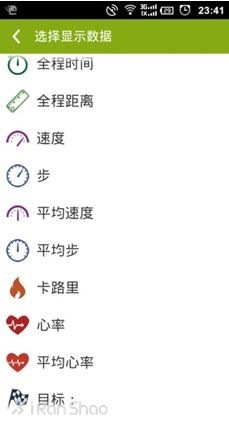 默认界面中上方最大的数字显示的是时间,下面左右并排显示的分别是距离和配速。这三个位置显示的内容可以按用户需求自行选择。操作很简便,点击相应位置,从出现的列表中选择自己需要监测的数据。具体选项见下图: