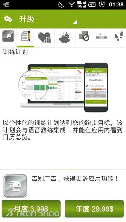 付费升级之后,在去掉广告之外,还可以开启更多、更细致的服务。比如训练计划、心率检测、天气信息、增加间歇训练、计步器、更详细的图表、自定义语音、省电模式等。