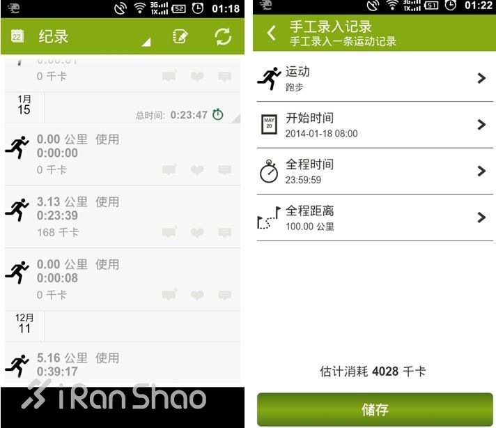 每次运动之后,本次数据会自动保存在“记录”页面中。点击页面上方的的图标还可以手工输入记录,以统计那些未带手机完成的里程。