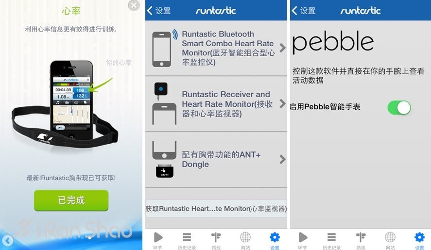 Runtasic pro通过配件支持三种规格制式的心率设备,我们经常使用的心率带都可以通过ANT+、蓝牙或Runtasitic自家的协议与Runtasic pro进行配对;同时我们惊喜的发现Runtasic 还支持目前火热的Pebble智能手表进行接入,实现远程的数据监控,时尚智能腕表搭配专业运动app的高大上组合,跑步的小伙伴们瞬间都投来了羡慕的眼光。