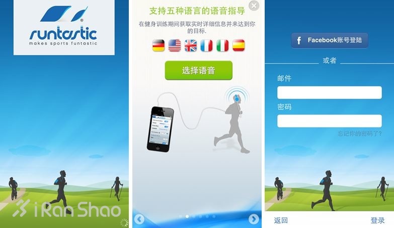 体会运动带来的乐趣是Runtastic的宗旨,蓝天绿草的开始画面带给用户愉悦的心情。Runtastic pro目前可以完整使用全中文界面,对于广大中文用户来说无疑是好消息,但在语音提示上还未能提供汉语语音。首次使用需要进行邮件注册,用以登陆软件以及在Runtastc运动社区中同步数据及获得更好的云端数据服务,当然还支持一些社交媒体的账号登录,目前还未支持国内的主流社交媒体。